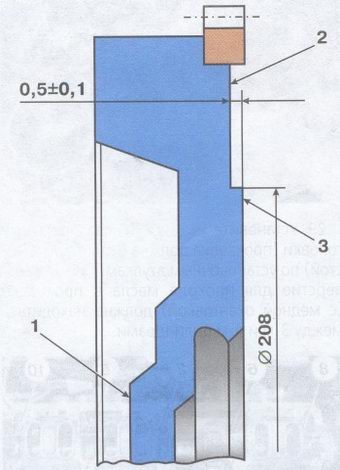 6.… фланца коленвала обнаружены риски и задиры. Проверить и отремонтировать маховик можно в мастерской, имеющей специальное оборудование. Неплоскостность поверхности 3 (рис. 4.4) прилегания ведомого диска сцепления не должна превышать 0,06 мм. Непараллельность поверхностей прилегания ведомого диска сцепления и поверхности 2 для крепления сцепления не должна превышать 0,1 мм. Биение маховика на поверхностях 3 и 1 не должно превышать 0,1 мм. Для удаления глубоких рисок и задиров поверхность 3 маховика можно проточить, при этом слой снимаемого металла не должен превышать 1 мм. Одновременно с поверхностью 3 необходимо проточить поверхность 2, выдерживая размер между ними (0,5+0,1) мм. При проточке выдержите параллельность поверхностей 3 и 1.
