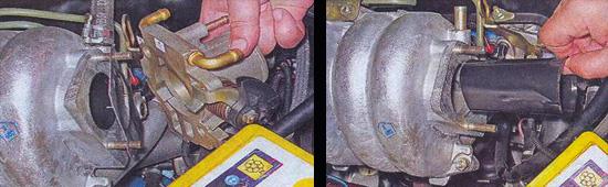 - Таким же способом, ослабив хомуты крепления снимаем широкий патрубок подвода воздуха к корпусу дроссельной заслонки и небольшого диаметра шланг подвода паров топлива.